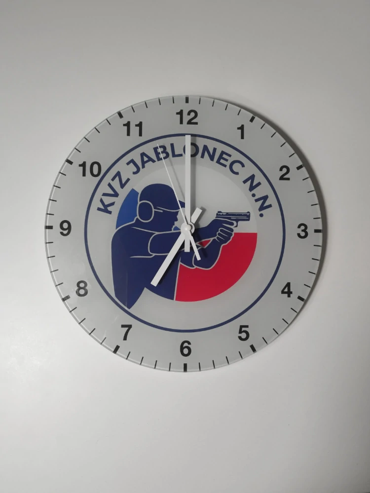 Stylové nástěnné hodiny ze skla s individuálním potiskem. Jsou ideálním doplňkem pro klubovny, střelnice, kanceláře i domácí pracovny.